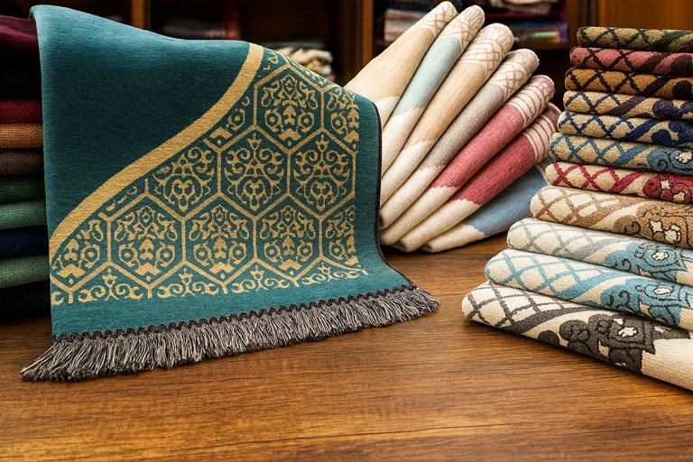 It is woven using multiple materials such as chenille, satin, and cotton, with the option to choose between premium lining or no lining, catering to different tastes and budgets. Each style undergoes strict quality checks to ensure colorfastness and fabric integrity in every piece, offering a wide range of colors suitable for all markets, along with the option to customize colors and quantities upon request.
